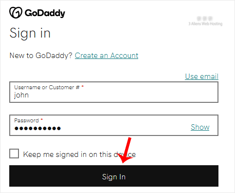 2. Enter the Username or Customer ID and the password of your GoDaddy account. Then click on Sign In.