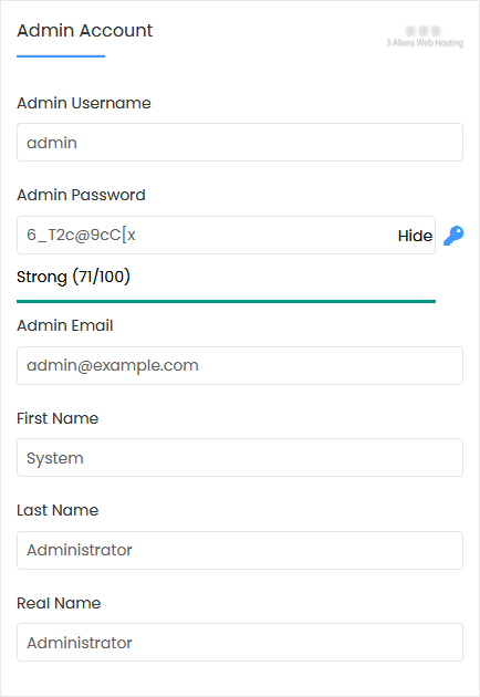 7. Under the Admin Account section, enter the following information: